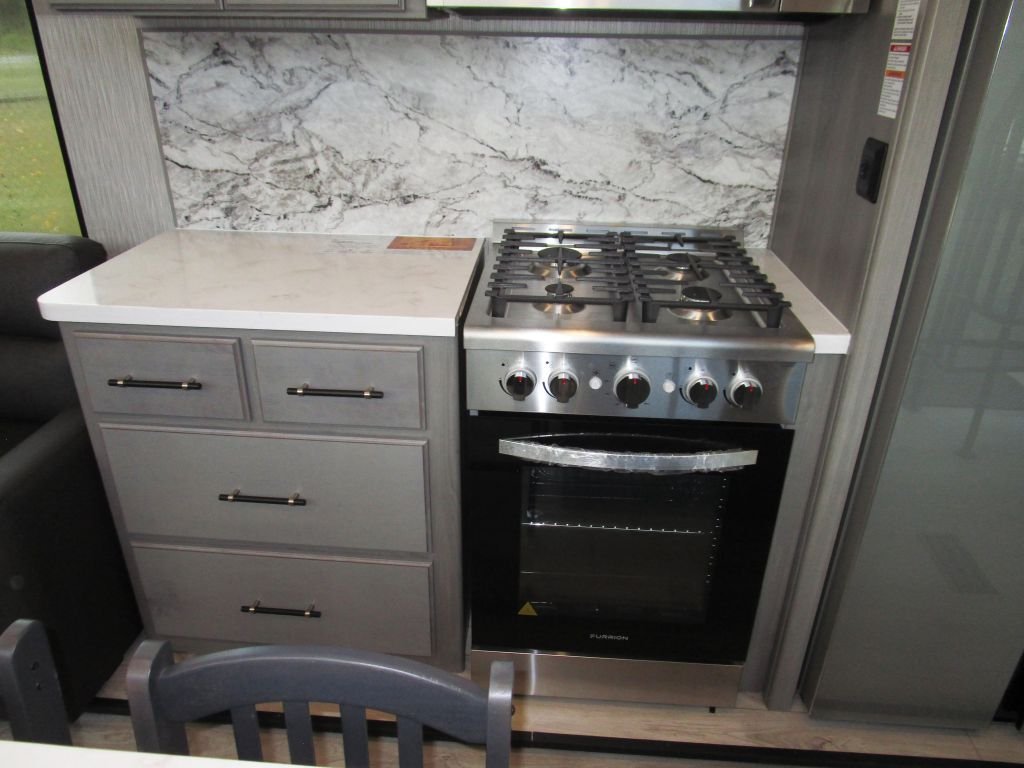 - Residential Kitchen: The mid-kitchen features full-sized, residential appliances, including a 15 cu ft stainless steel refrigerator and a free-standing range with four burners, making meal preparation a breeze.
