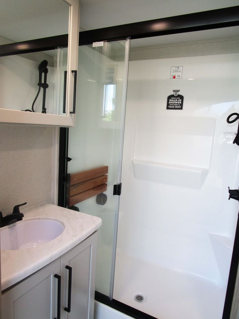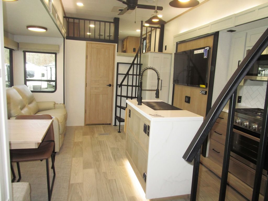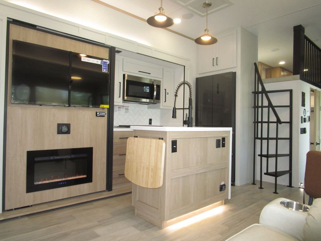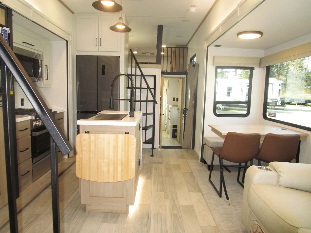 Destination Package: Detachable Hitch19 Cubic FT Stainless Refrigerator (12V)3.7 Free Standing Range with 4 Burners, Two 15,000BTU Air Conditioners, 60,000BTU On Demand Water Heater, High Efficiency Radiant Foil (Roof and Floor), Ceiling Paddle Fan (Living and Bedroom where available), Heated and Enclosed Holding Tanks (12V pads)
