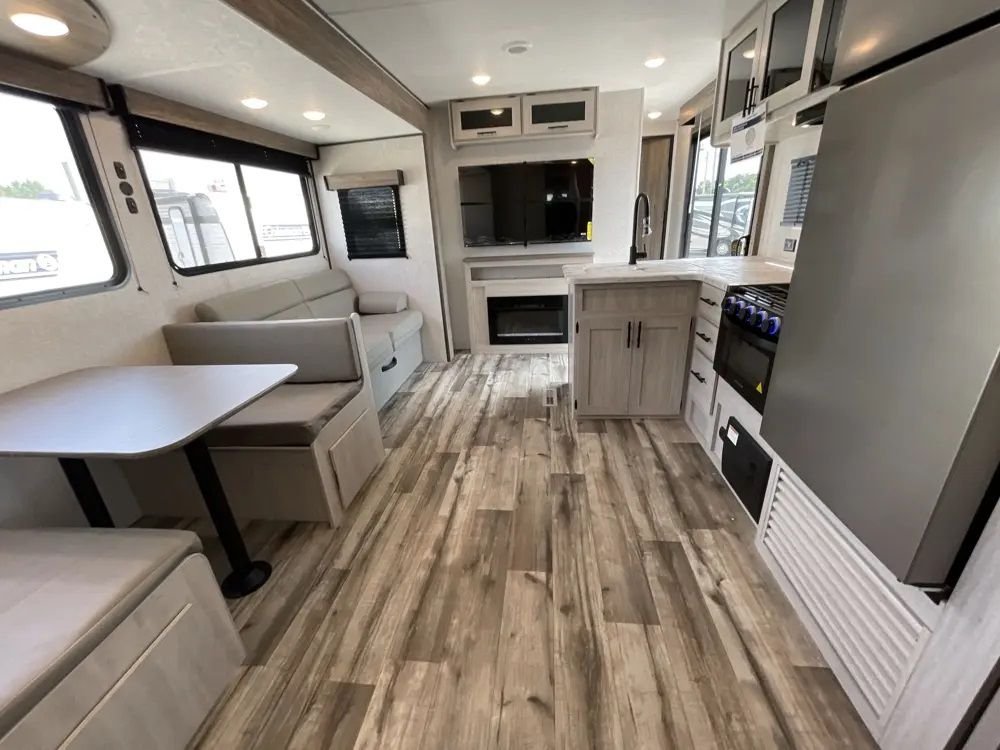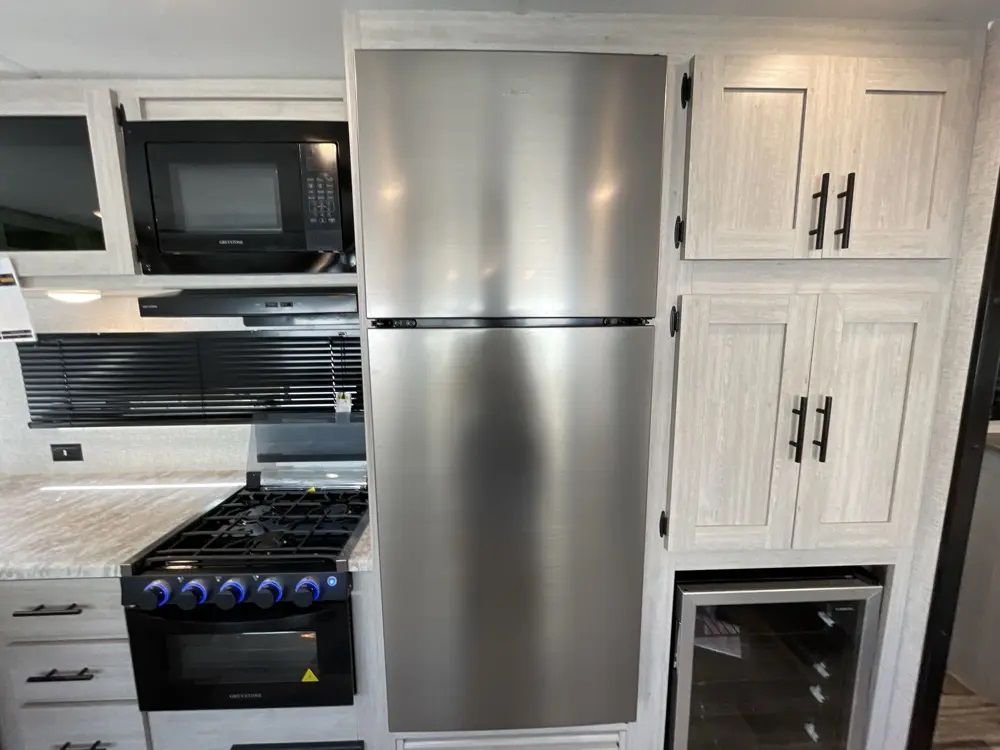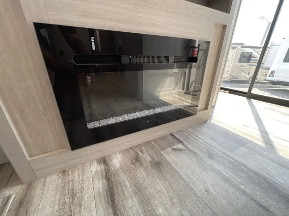 The kitchen is a chef's dream, featuring a 10 Cu. Ft. 12-Volt refrigerator, a microwave oven, a stainless steel sink, and a wine cooler—perfect for entertaining. The LED accent lighting and fireplace create a warm, inviting atmosphere for cozy evenings.