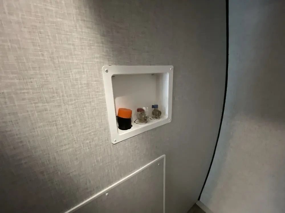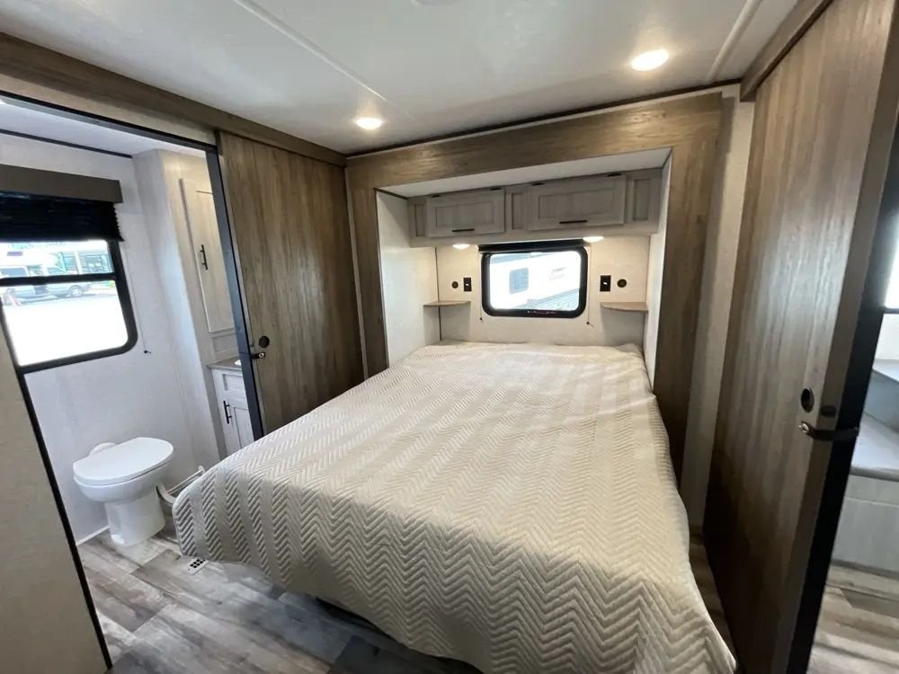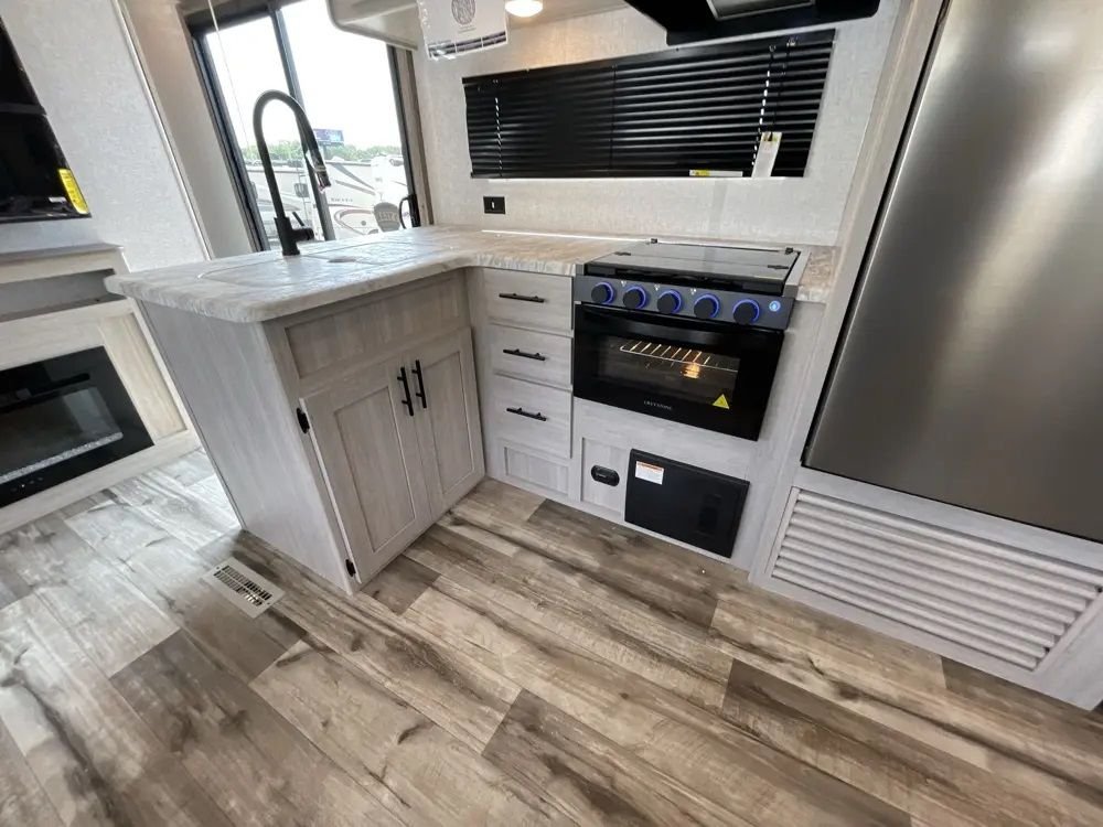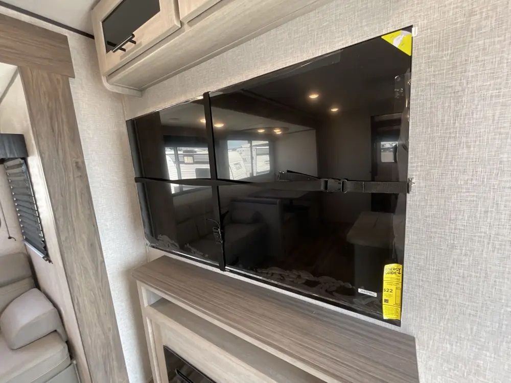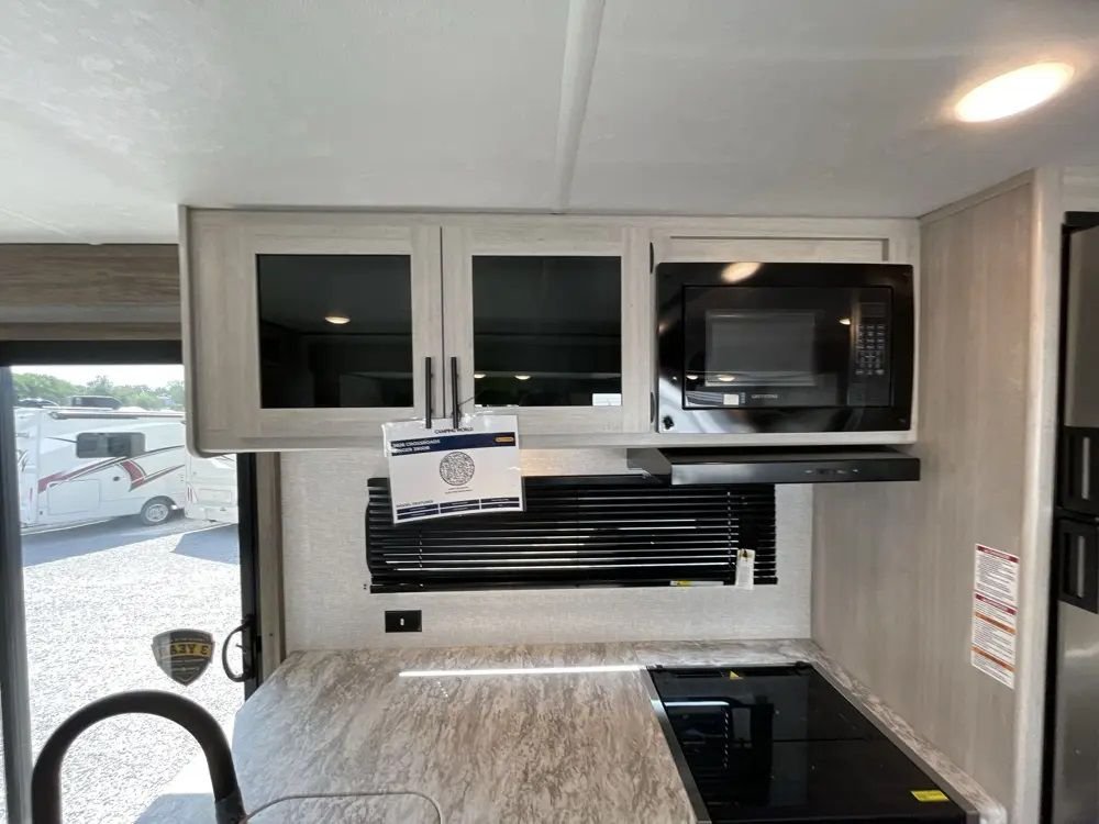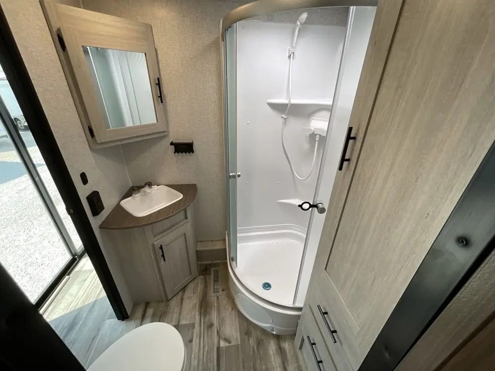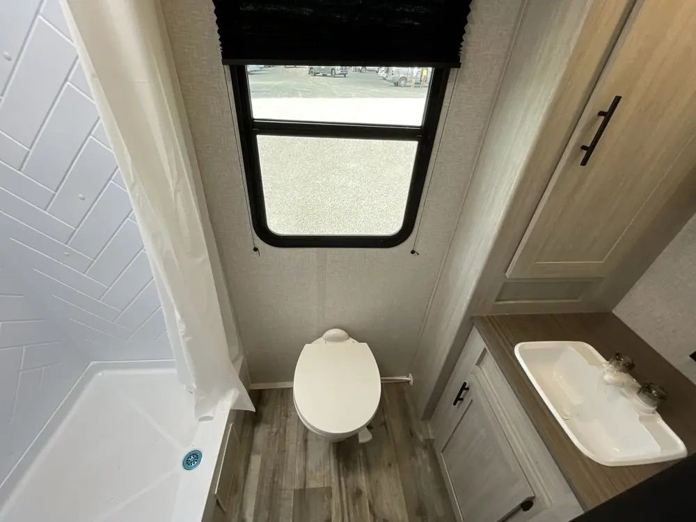 This trailer is packed with features that make life on the road effortless. The solar power and WiFi prep mean you can stay connected and go off-grid whenever you choose. The backup camera prep, secure stance entry step, and outside shower add convenience and safety to your travels. With a bumper for drain hose storage and large lavatory bowls, every detail is designed for practicality and ease of use.