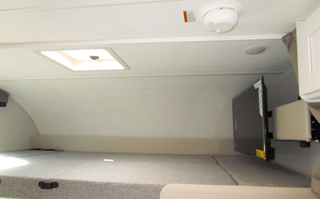 Step inside, and you'll immediately appreciate the design that prioritizes spaciousness. The 80" interior ceiling height creates an open, airy feel that makes the 19Z feel anything but small. Settle into the rear U-dinette, where a single pedestal leg table offers a comfortable spot for a meal, a game of cards, or a workspace with a view. After a day of adventure, the cab-over sleeping area provides a cozy, private retreat, complete with a 32” Smart TV on a manual swivel, perfect for unwinding with a movie.