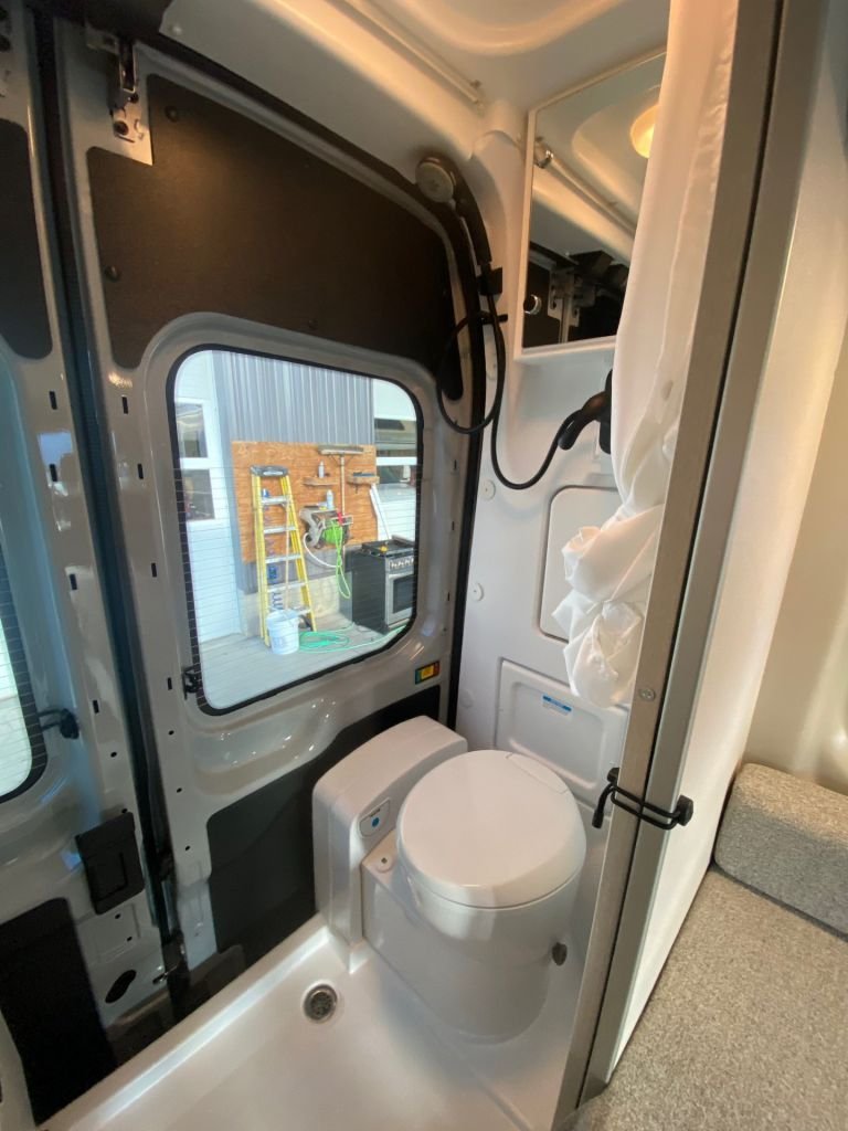 The Wet Bath: A fully enclosed shower and a Cassette Toilet (which means the customer doesn't have to visit a "stinky slinky" dump station; they can just remove the small tank and empty it in any standard restroom).