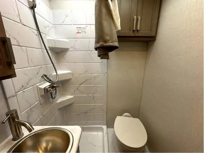 Comfort Station: Foot-flush porcelain toilet and a spacious shower with a skylight.