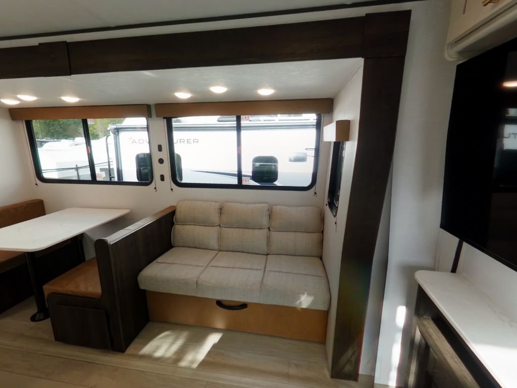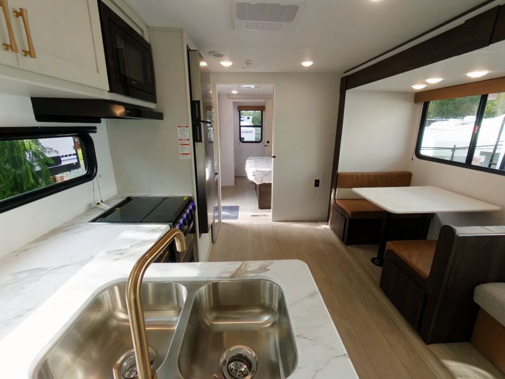 This trailer is packed with features that make life on the road effortless. The solar power and WiFi prep mean you’re always connected and can go off-grid whenever you choose. The backup camera prep, secure stance entry step, and outside shower add convenience and safety to your travels. The storage doors below the dinette and generous storage throughout the trailer give you plenty of space to bring all your gear and a few of your favourite things.