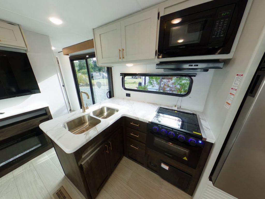 The kitchen is a chef's dream, featuring a 10 Cu. Ft. 12-Volt refrigerator, a microwave oven, a stainless steel sink, and a wine cooler—perfect for entertaining. The LED accent lighting and fireplace create a warm, inviting atmosphere for cozy evenings.