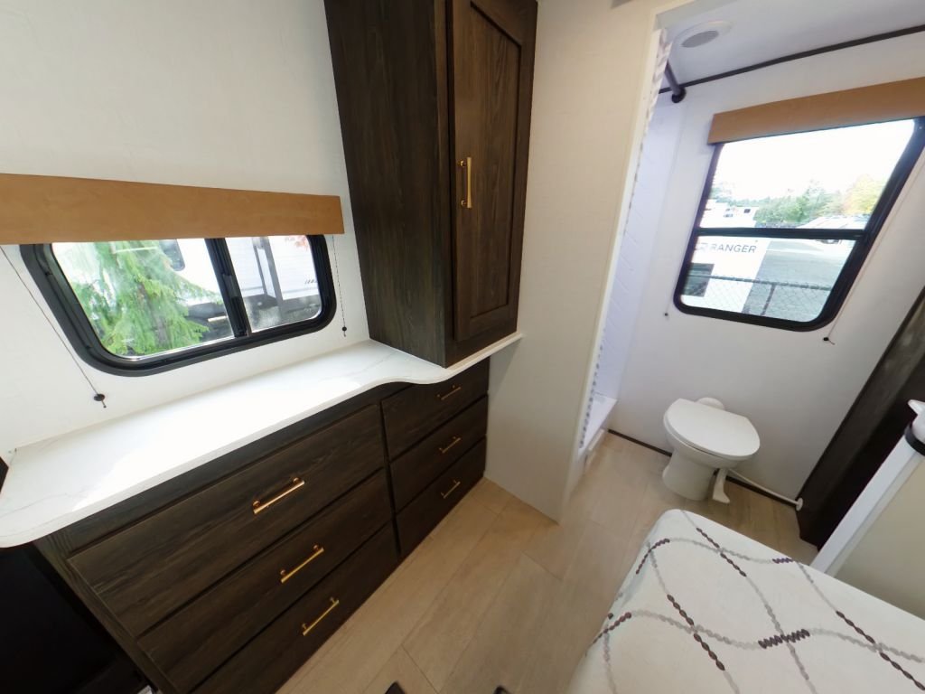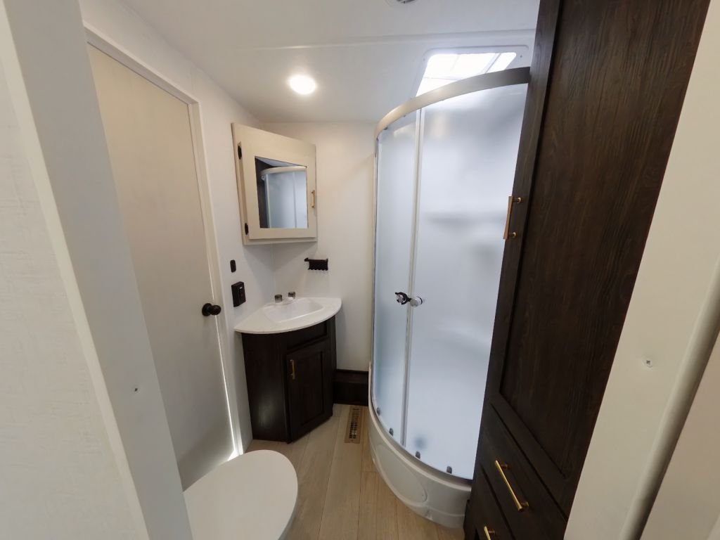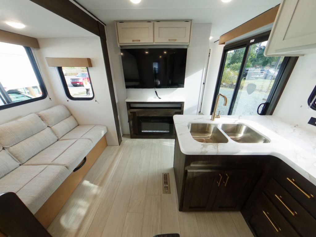 This trailer is packed with features that make life on the road effortless. The solar power and WiFi prep mean you can stay connected and go off-grid whenever you choose. The backup camera prep, secure stance entry step, and outside shower add convenience and safety to your travels. With a bumper for drain hose storage and large lavatory bowls, every detail is designed for practicality and ease of use.