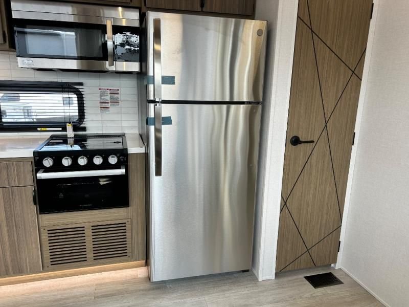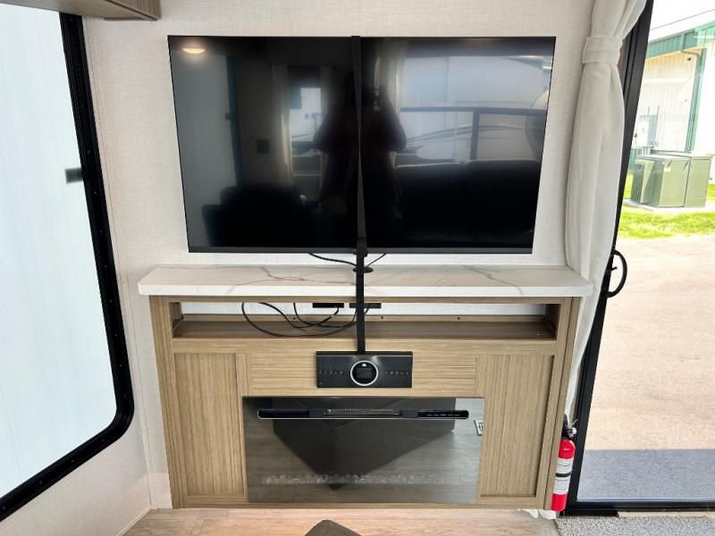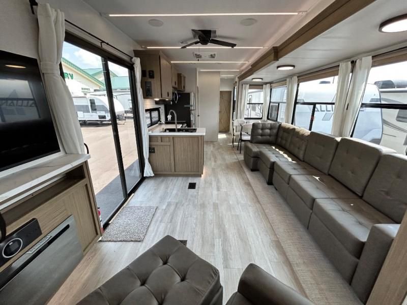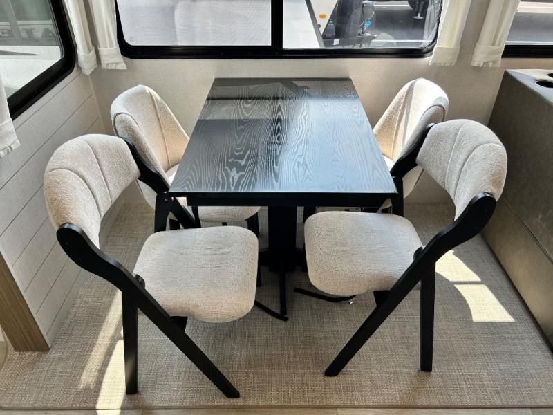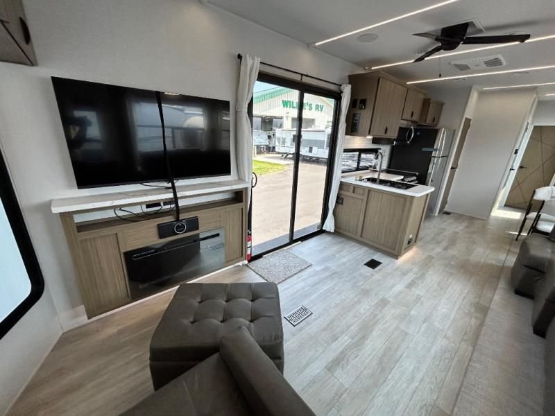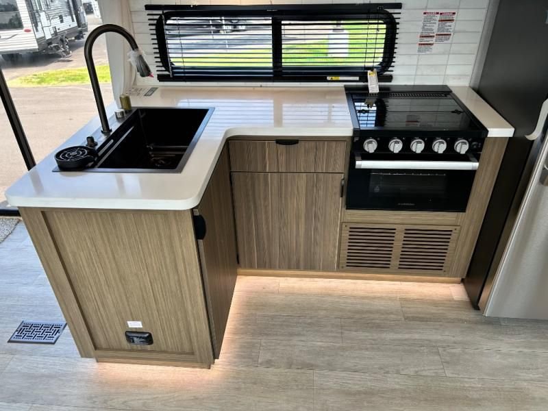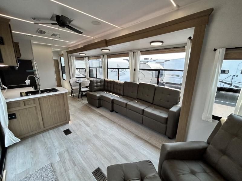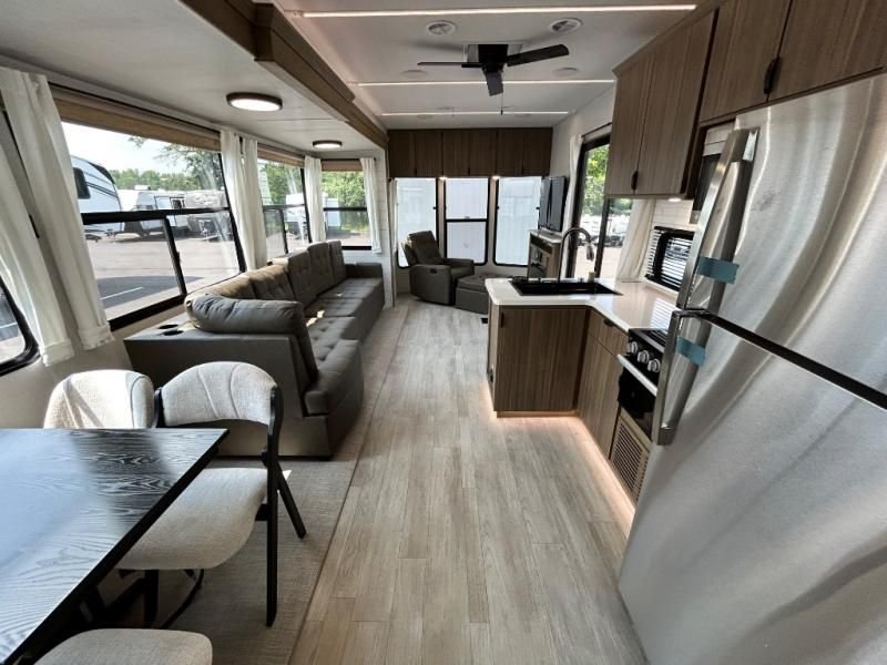 The kitchen is a true chef's paradise, equipped with stainless steel residential appliances, including a large refrigerator and an oversized 1.6 cu. ft. microwave. The Rainfall Versa-Sink and solid surface countertops make meal prep a pleasure. After dinner, relax on the couch or theater seating and enjoy the premium sound from the JBL 3-Zone Media Center and the warm, customizable glow of the dimmable LED "Blade Lighting."