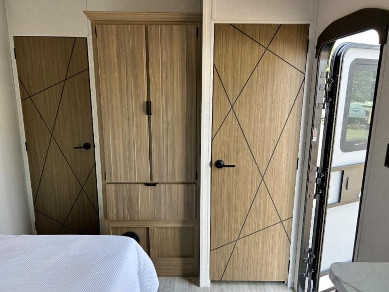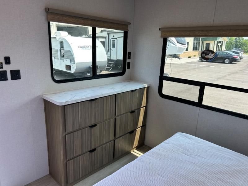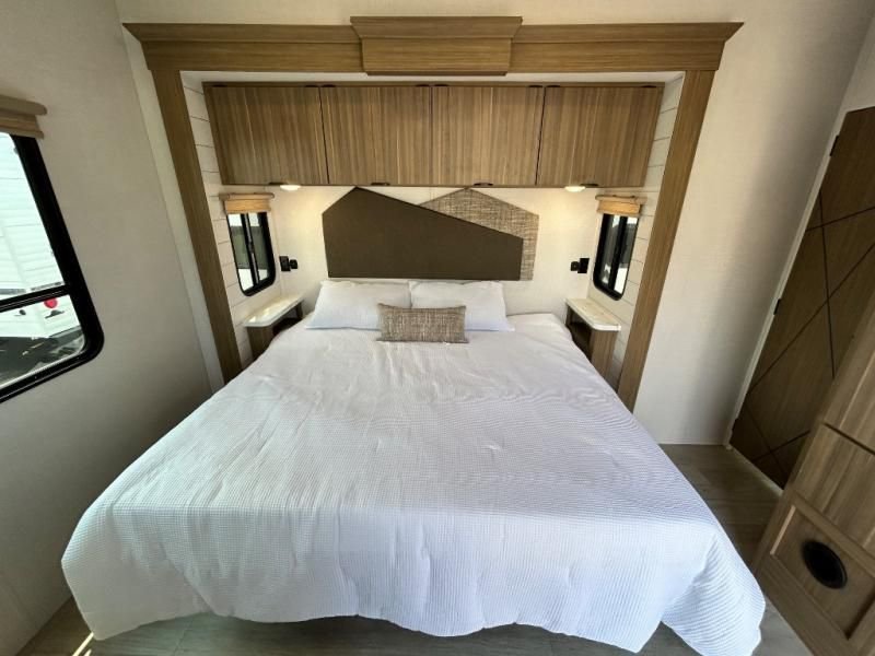 When it's time to rest, the large rear king bedroom offers a peaceful retreat with a comfortable Serta mattress and a Versa-Tilt bed. There's no shortage of storage, and you'll find the convenience of an optional washer/dryer hookup. The adjacent bathroom is a sanctuary, featuring a walk-in shower with a seat and a skylight for natural light.