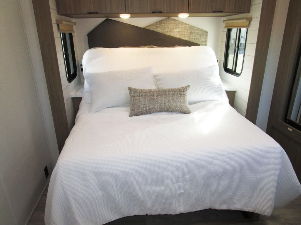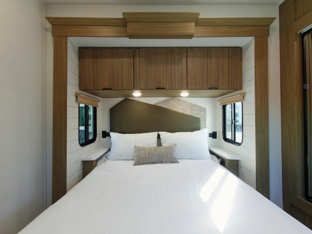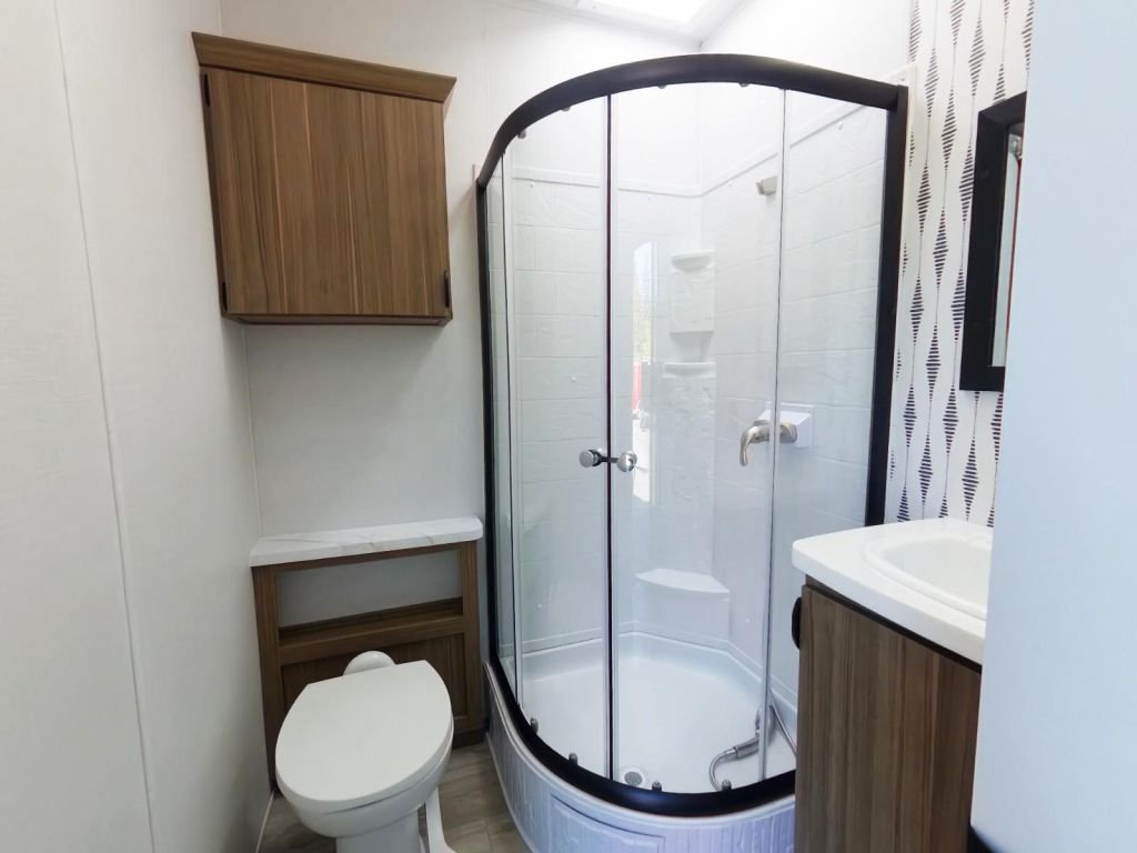In the front of the trailer, the large queen bedroom is a peaceful retreat for parents, complete with a comfortable Serta mattress and a Versa-Tilt bed. The adjacent bathroom features a walk-in radius shower with a built-in seat and plenty of storage.