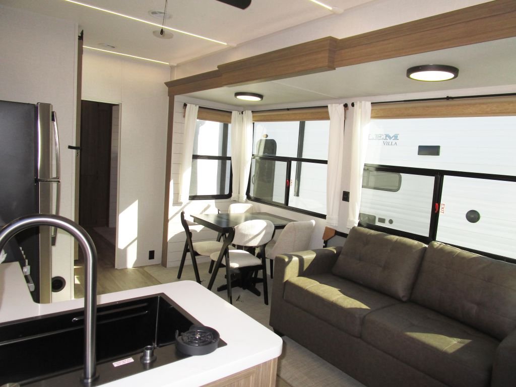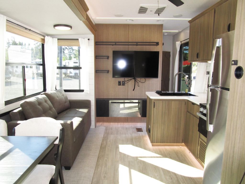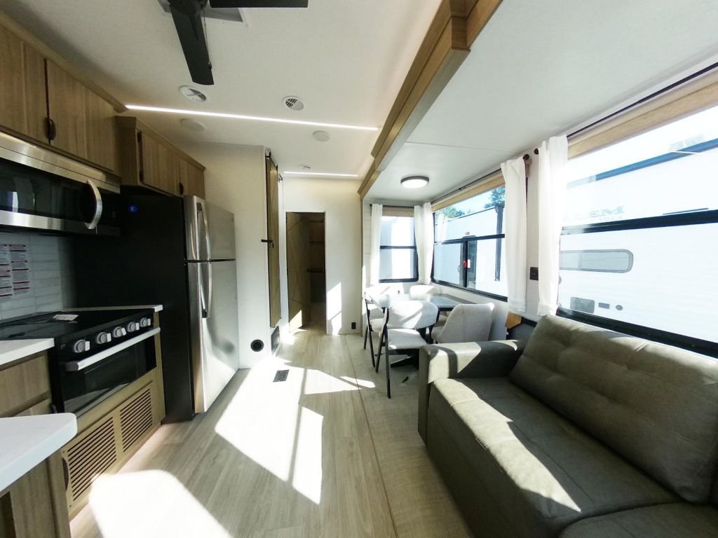 Step inside and discover the ultimate family floorplan with four slides that maximize every inch of space. The main living area feels open and inviting with an electric fireplace, a tri-fold sofa, and a breathtaking view through the panoramic windows. Enjoy your favorite tunes with the JBL 3-Zone Media Center and set the perfect mood with dimmable LED "Blade Lighting."