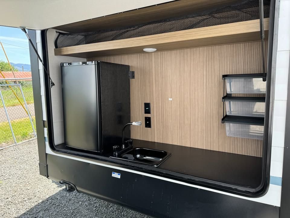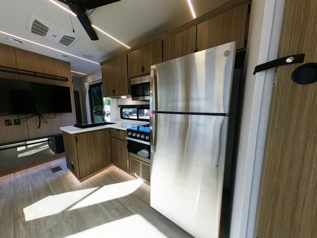 Cooking is a breeze in the modern kitchen, which features stainless steel appliances and a stunning Rainfall Versa-Sink with a farmhouse faucet. But the real star is the outdoor kitchen, perfect for grilling and entertaining under the stars. The exterior also includes a large awning with JBL speakers and 4K Blade Lighting, creating the ideal outdoor living space.