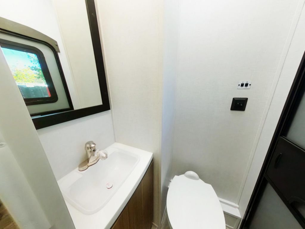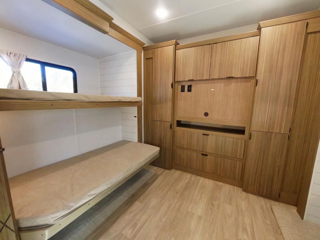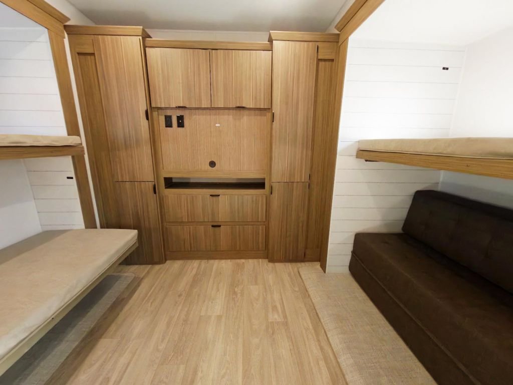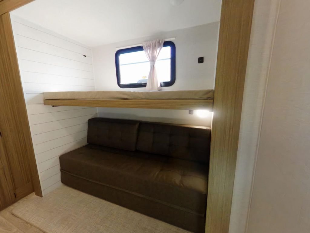 The dedicated bunk room is a kid’s dream and a parent’s delight. It features three bunks plus a Versa-Queen that easily converts into a sofa, another bunk, or a queen bed, giving you endless sleeping options. For added convenience, the bunk room has its own half bath with a door to the outside, so no more tracking dirt through the main living area.