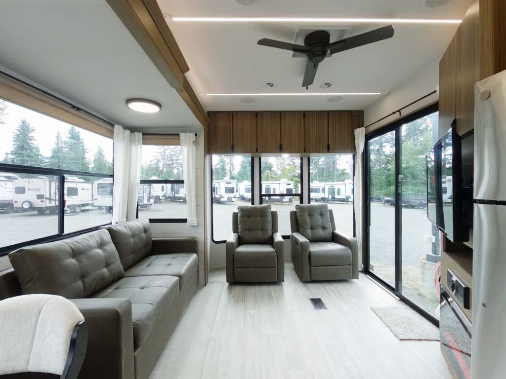 Step inside and feel the difference. The interior boasts a modern, stylish remodel with a retro metal redesign, elegant TFL Black Walnut shelves, and Lock & Groove Shiplap Islands. The living area is a comfortable retreat with a sofa and theater seating, perfect for relaxing while you take in the scenery through the panoramic windows. You’ll love the premium sound from the JBL 3-Zone Media Center and the warm ambiance of the dimmable LED "Blade Lighting."