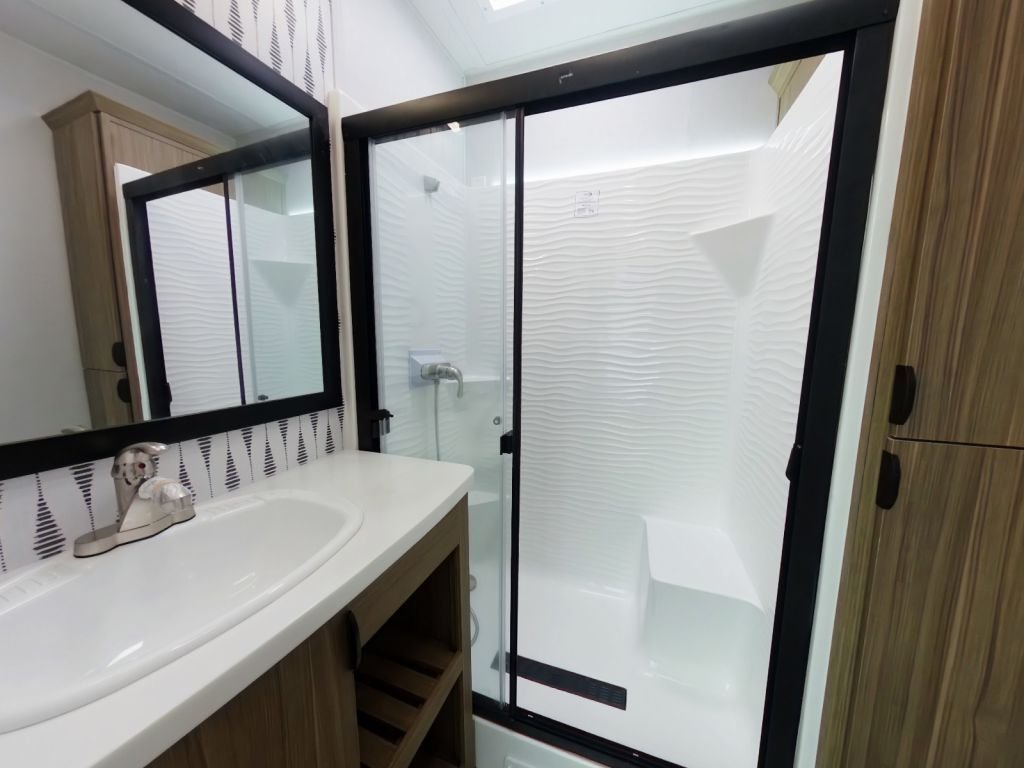 The kitchen is a chef's dream, featuring a residential refrigerator, a large oven, and a beautiful farmhouse sink with a Rainfall Versa-Sink faucet. When it's time to rest, the spacious rear king bedroom offers a Serta mattress and a Versa-Tilt bed for ultimate comfort, plus loads of storage. The attached bathroom includes a large walk-in shower with a seat and a linen closet.