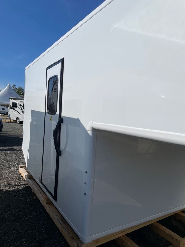 Includes: 1 Radius acrylic thermal awning windows with built in screen and blinds • Composite entry door with screen • 4 season construction • Laminated composite panel technology construction • R9 fully insulated panel construction with no wood or thermal transfer • Bonded aluminum corner extrusions • 1 piece seamless roof, Tie down straps (Set of 2)