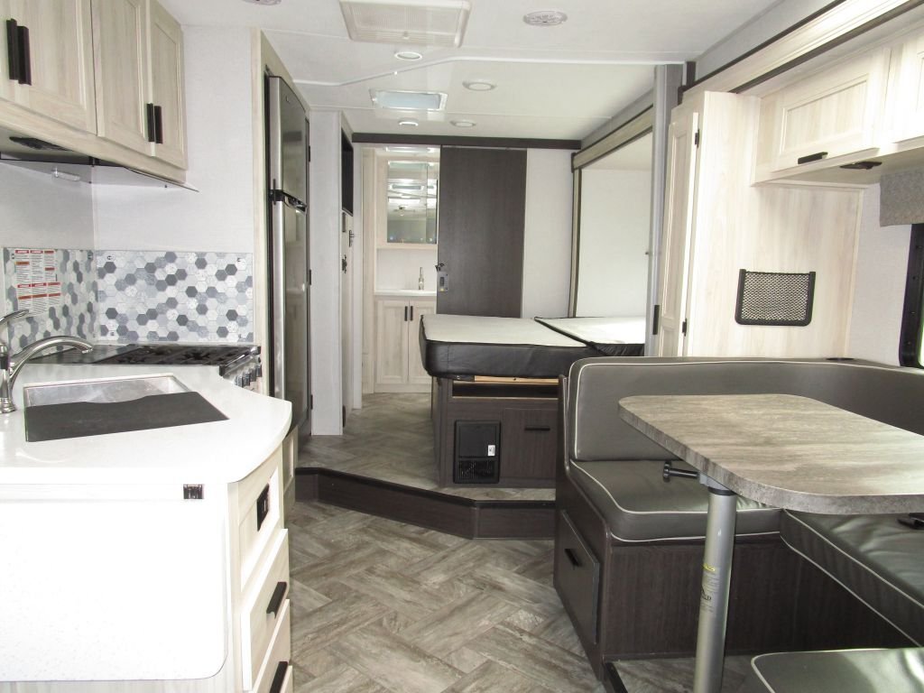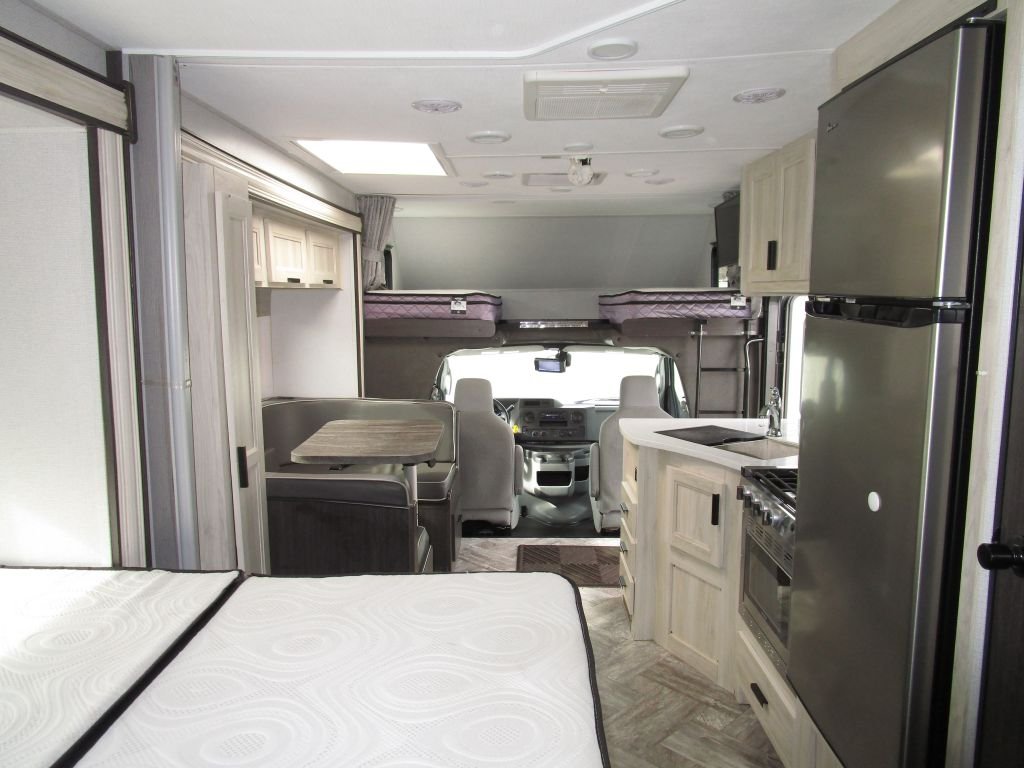 •  Sleeps 4-6: Queen-size rear bed, a dinette that converts to a second bed, and a spacious cab-over bunk with dual windows.