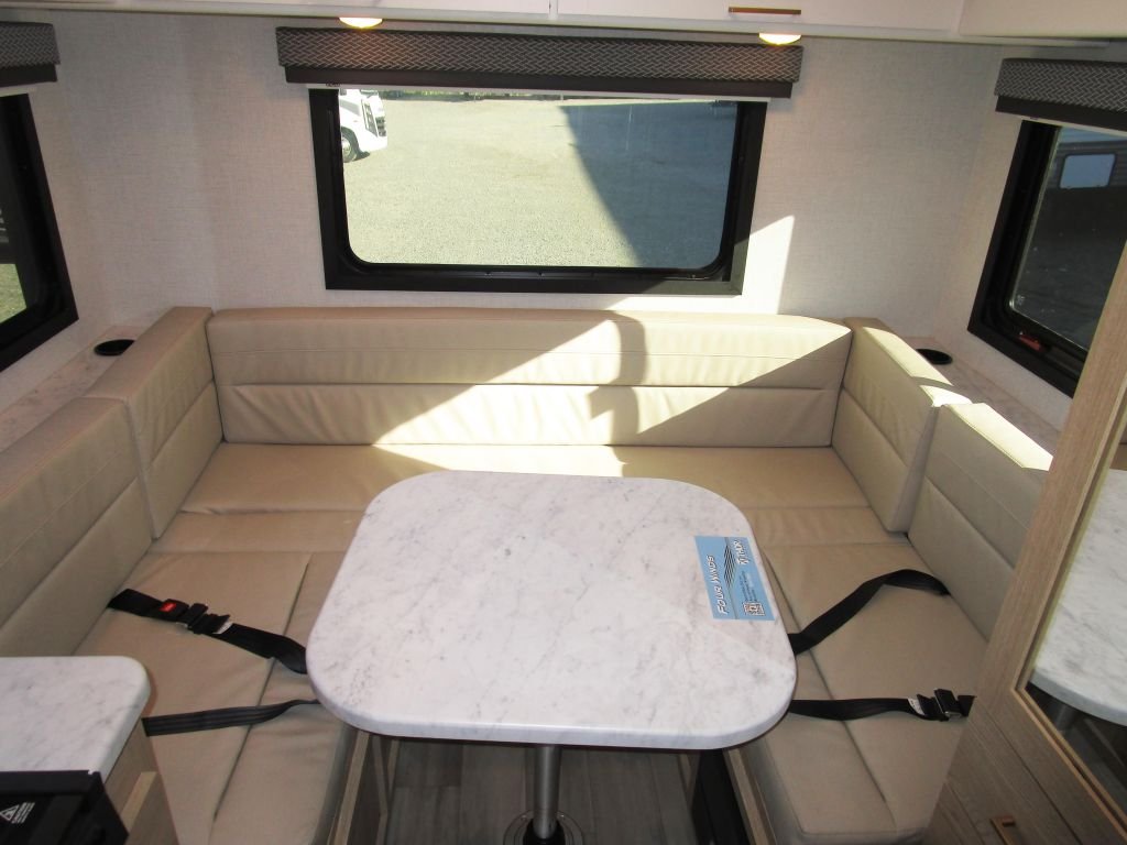 Step inside, and you'll immediately appreciate the design that prioritizes spaciousness. The 80" interior ceiling height creates an open, airy feel that makes the 19Z feel anything but small. Settle into the rear U-dinette, where a single pedestal leg table offers a comfortable spot for a meal, a game of cards, or a workspace with a view. After a day of adventure, the cab-over sleeping area provides a cozy, private retreat, complete with a 32” Smart TV on a manual swivel, perfect for unwinding with a movie.