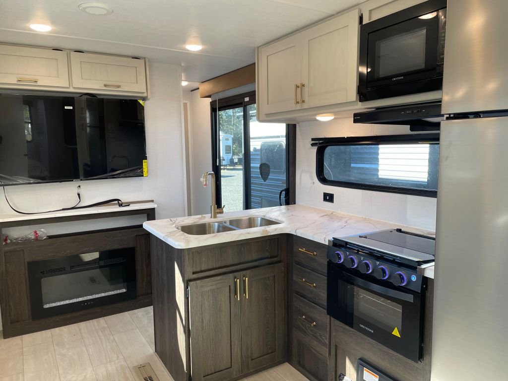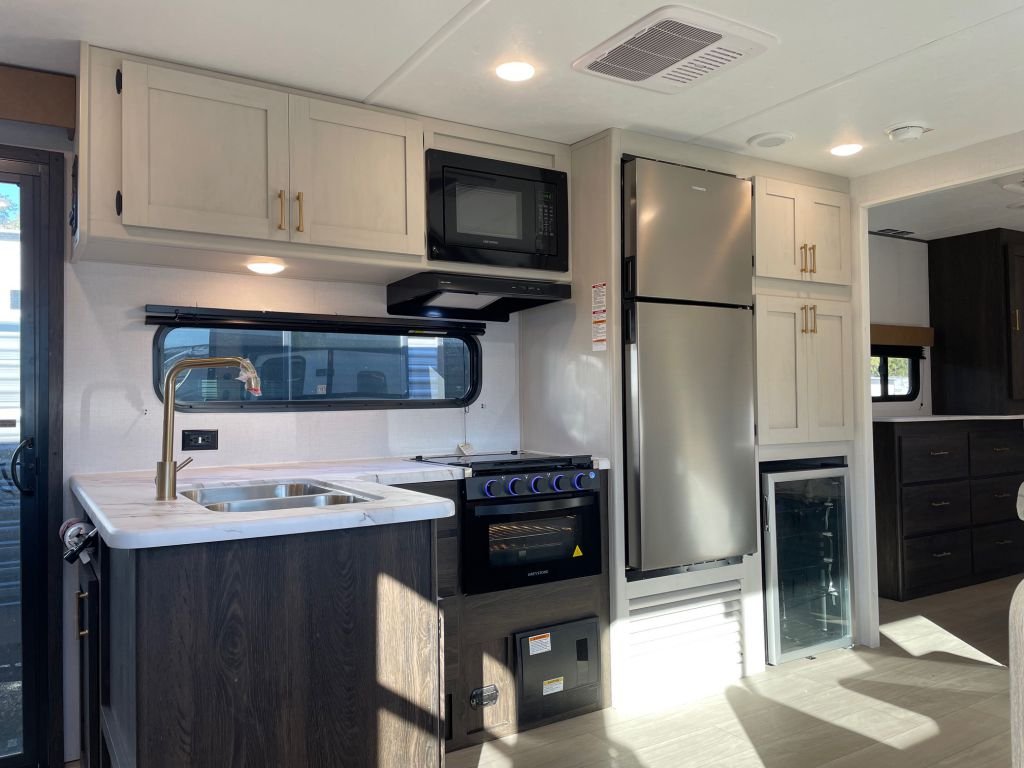 The kitchen is a chef's dream, featuring a 10 Cu. Ft. 12-Volt refrigerator, a microwave oven, a stainless steel sink, and a wine cooler—perfect for entertaining. The LED accent lighting and fireplace create a warm, inviting atmosphere for cozy evenings.