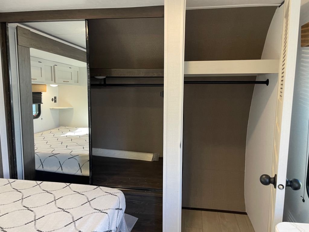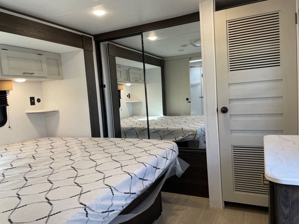 Step inside and feel the difference. With an 81-inch interior ceiling height and a flush floor slide-out, this trailer feels more like a modern apartment than a typical RV. The two-bedroom, two-bathroom layout provides all the space you need for family or guests, while the King-sized bed in the master bedroom offers a luxurious retreat at the end of the day.