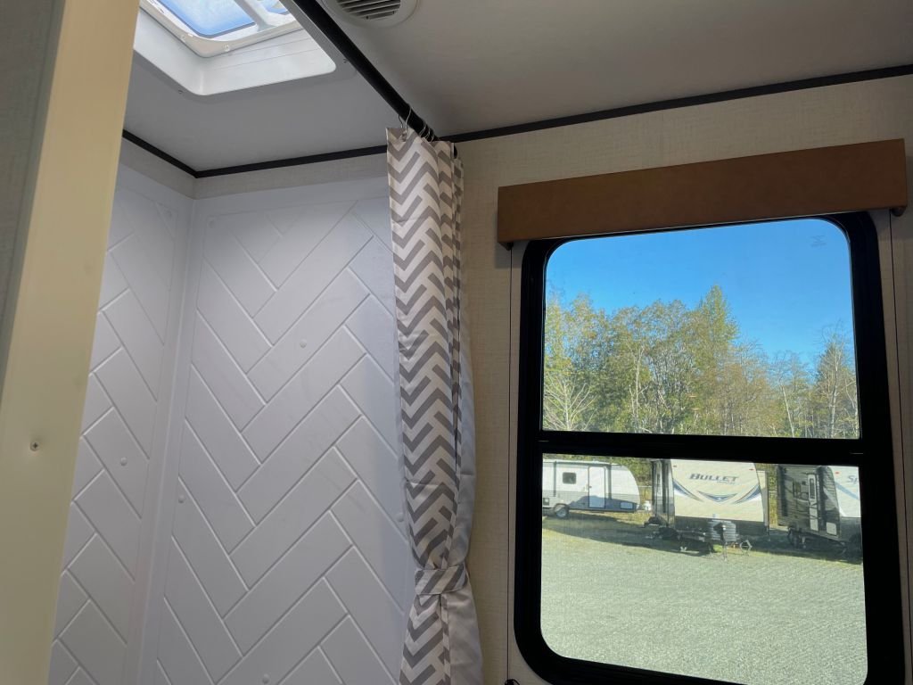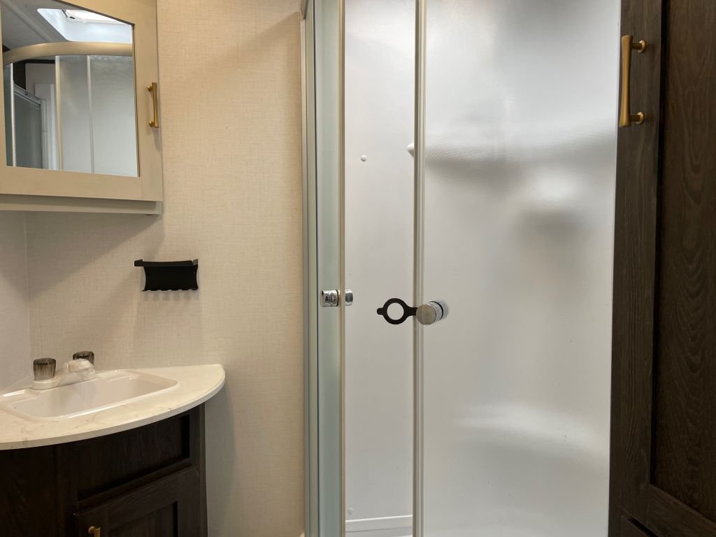 This trailer is packed with features that make life on the road effortless. The solar power and WiFi prep mean you’re always connected and can go off-grid whenever you choose. The backup camera prep, secure stance entry step, and outside shower add convenience and safety to your travels. The storage doors below the dinette and generous storage throughout the trailer give you plenty of space to bring all your gear and a few of your favourite things.
