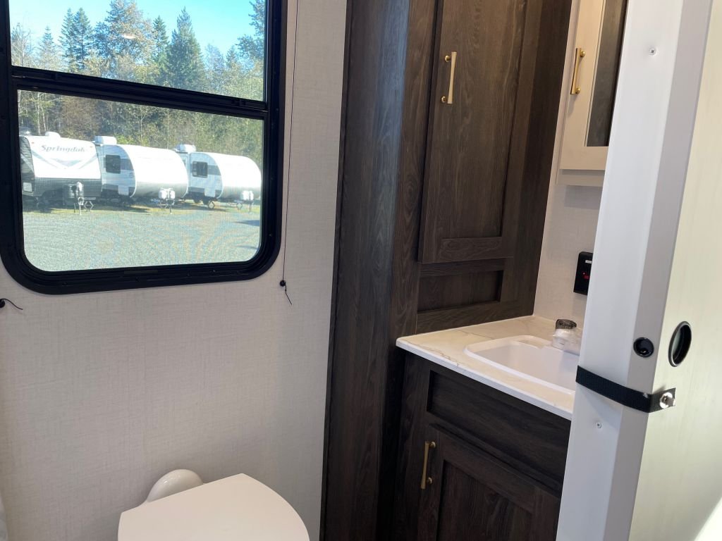 This trailer is packed with features that make life on the road effortless. The solar power and WiFi prep mean you can stay connected and go off-grid whenever you choose. The backup camera prep, secure stance entry step, and outside shower add convenience and safety to your travels. With a bumper for drain hose storage and large lavatory bowls, every detail is designed for practicality and ease of use.